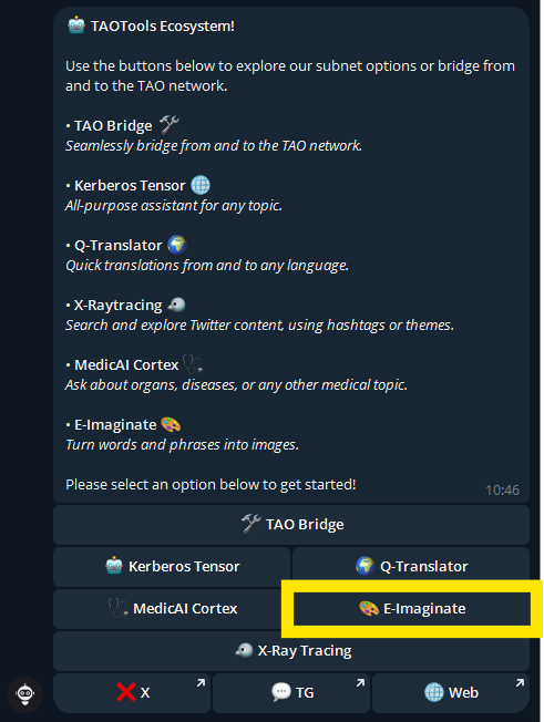 To access E-Imaginate through our Telegram bot, navigate to our [Website](https://www.taotools.ai) and hit the 'Open Bot' button or navigate directly to our [Telegram Bot.](https://t.me/TAOToolsInteractBot) Simply hit the 'E-Imaginate' button after prompting /start to open this subnet. From here, input a prompt to generate an AI image around that topic.